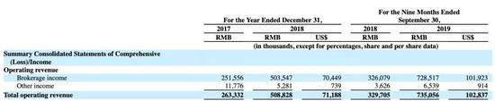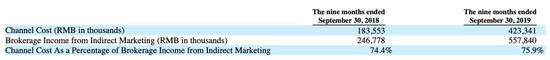 此外,2017年和2018年,通过平台销售保险合作伙伴承销的保险产品而产生的佣金收入占总收入的比例分别为95.5%和99%,2019年前9个月也达到了99.1%。