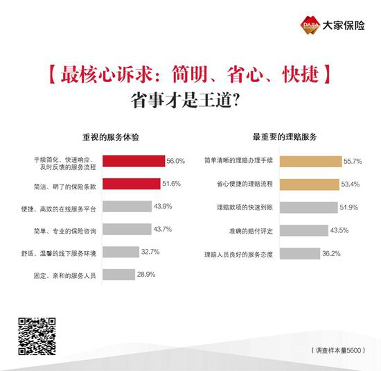 消费者希望耗费较少的精力来处理保险事宜,手续简明、过程省心、流程快捷是对服务的核心诉求。同时,消费者希望保险公司官方渠道保持畅通,一旦出现代理人离职等情况,通过电话等方式快速“预约人工服务”进行弥补。
