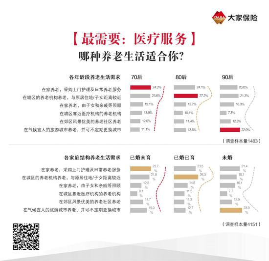 值得一提的是,在对养老生活期待上,80后的选择与“已婚已育”人群选择相近;90后的选择与“未婚”人群选择相近。
