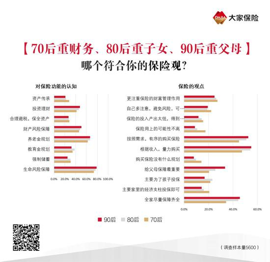 70后保险观念较为保守,认为保险的投入产出较低,配置意愿度低,更注重保险的财务管理作用;80后对保险的理念比较理性,侧重全家保障,关注子女;90后侧重关注父母,希望全家尽量保障齐全,按需购买保险。