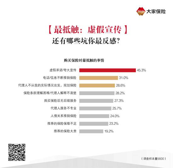 调查显示,在购买保险时,“虚假宣传、夸大承诺”成为消费者最抵触的事情,比例占45.3%。关注“电话/信息不断推销保险”“代理人不从我的实际情况出发”等问题的比例也很高,分别为31.0%和28.6%。