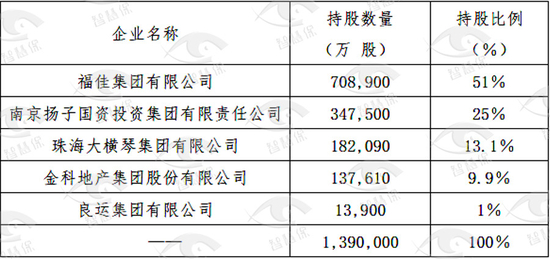 此次股权受让方共计5家,包括福佳集团有限公司、南京扬子国资投资集团有限责任公司、珠海大横琴投资有限公司、金科地产集团股份有限公司、良运集团有限公司。