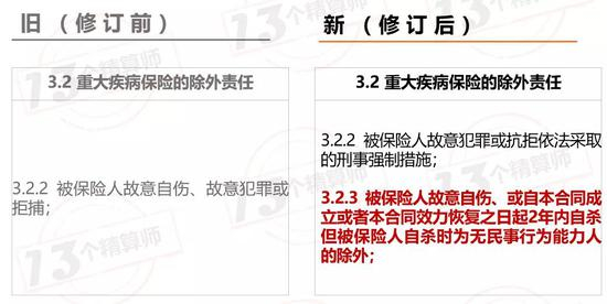 主要的变化,是将原来的3.2.2条,拆分成了3.2.2条和3.2.3条,对于被保险人自伤和自杀的除外责任进行了单独的表述。