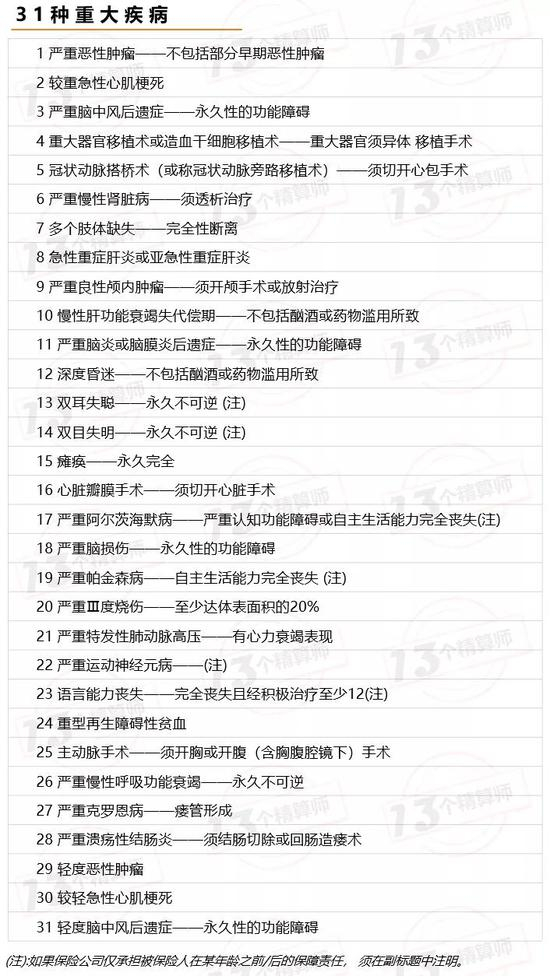 其中,重度疾病包括28种,轻度疾病包括3种,总计31种。