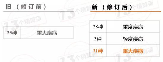 从这一点看,较原来的25种重大疾病相比,此次新修订的重疾进行了分级,还扩充到了31种。