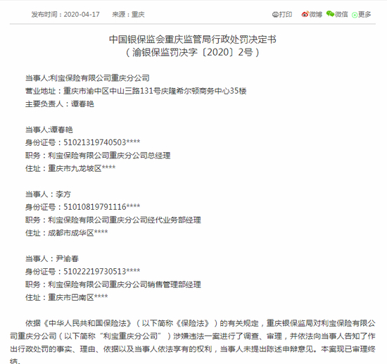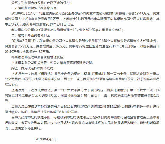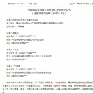 4月17日消息,中国银保监会重庆监管局公布的行政处罚信息公开表显示,利宝保险有限公司重庆分公司存在编制虚假财务资料套取资金、虚构中介业务套取佣金的行为。中国银保监会重庆监管局决定对利宝保险有限公司重庆分公司给予15万元罚款的行政处罚,对谭春艳警告并罚款1万元,对李方警告并罚款1万元;对尹渝春警告并罚款1万元。
