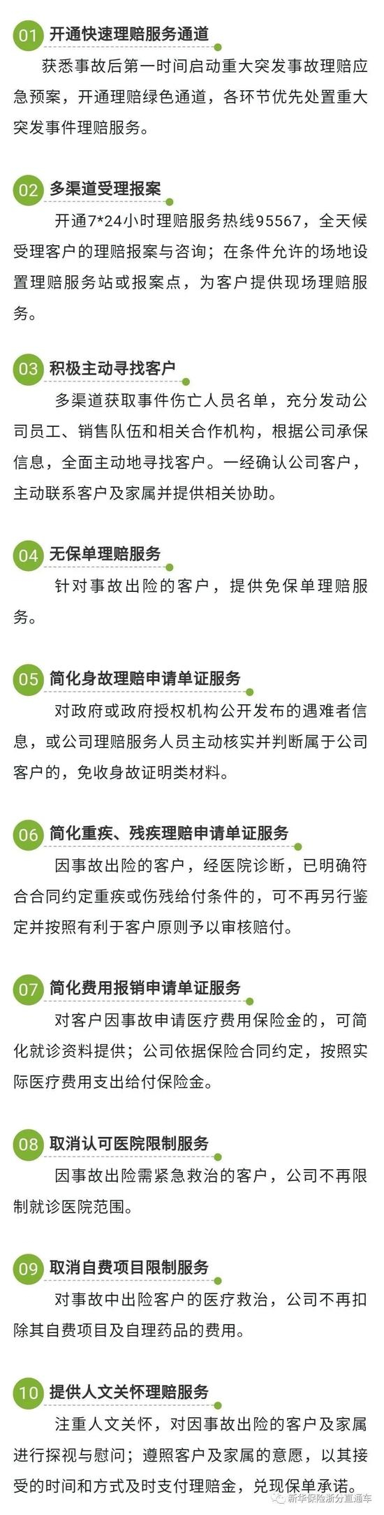 事故发生后,为切实做好事故理赔工作,新华保险浙江分公司启动应急响应,第一时间成立应急领导组,指导部署相关工作的开展。浙江分公司运营部已安排工作组紧急进行伤亡人员信息排查。同时,紧急启动十大应急服务举措,为保险理赔、紧急救援提供便利: