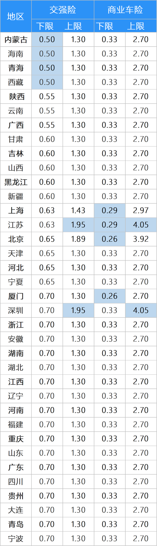 交强险及商业险浮动范围