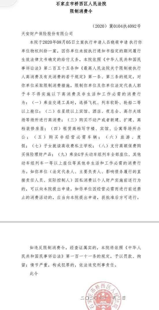 天安财险被限制高消费 关联人郭予丰乘飞机、度假等消费行为受限