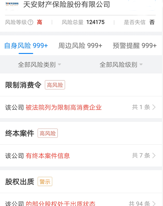 根据天眼查最新信息,11月2日,石家庄市桥西区人民法院发布限制消费令,因一桩物权纠纷案,天安财险被限制消费,其法定代表人郭予丰被限制高消费。郭予丰曾任天安财险股东公司西水股份的董事长兼总经理、天安财险董事长,目前为西水股份法定代表人,其作为关联对象,在乘坐交通工具、旅游、度假、购买不动产等诸多方面受限。