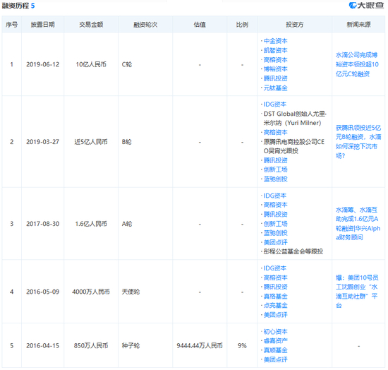 成立之初,水滴公司就获得850万元种子轮融资及4000万元天使轮融资,投资方包含美团点评、IDG资本、腾讯投资等明星资本。2019年3月,公司获得腾讯领投的B轮融资,融资达到近5亿元。2019年6月,公司又快速迎来超10亿元的C轮融资,由博裕资本领投,腾讯投资、中金资本等跟投。