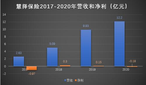 从整体业绩上来看,2018年和2019年,慧择保险保持了90%以上的同比增速。而2020全年,慧择仅实现12.2亿元的营收,营收增速从2019年度内95%,放缓至23%。增速下滑明显。