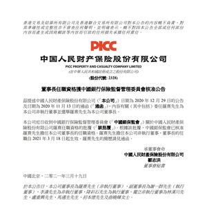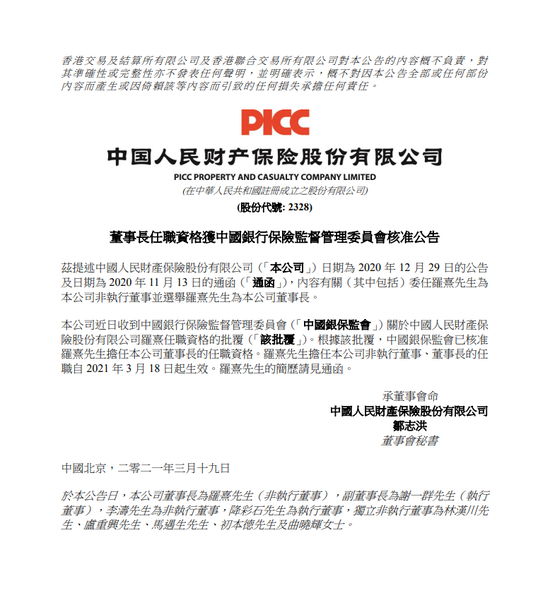 3月19日消息,中国财险发布公告,公司近日收到中国银行保险监督管理委员会关于中国人民财产保险股份有限公司罗熹任职资格的批覆。根据该批覆,中国银保监会已核准罗熹先生担任公司董事长的任职资格。罗熹先生担任公司非执行董事、董事长的任职自2021年3月18日起生效。