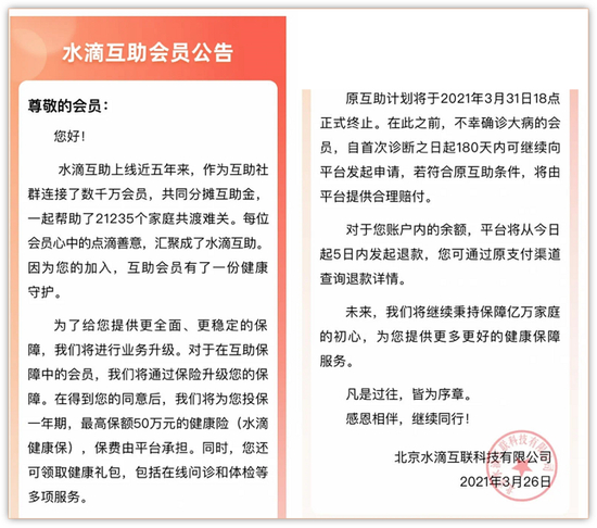 沈鹏在公开信中表示,将终止目前水滴互助平台运营的“大病互助计划”“综合意外互助计划”以及“百万抗癌互助计划”,用更高性价比的商业健康险服务来替代互助计划。
