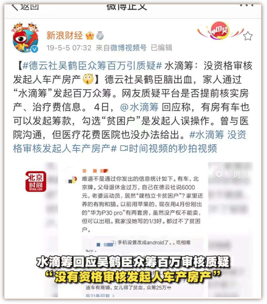 2019年,有车有房的德云社相声演员吴鹤臣“诈捐”式筹款,水滴筹的审核系统遭到质疑。为此,有媒体专门对水滴筹审核进行暗察,由此牵出了关于网络众筹的行业黑产链。此举一度引发了信任危机,沈鹏亲自道歉。