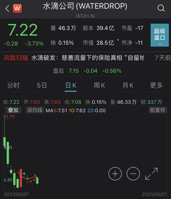 截至5月22日收盘,水滴的股价仅为7.22美元/ADS,较发行价12美元/ADS跌去了39.8%;当日市值仅为为28.46亿美元,远低于37亿美元的估值。