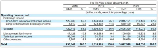 招股书也显示,水滴的收入主要来自与佣金相关的经纪收入(向保险公司收取佣金,以促进保险单的销售)。2019年,公司净营业收入总额增长534.6%,从2018年的2.381亿元人民币增至15.110亿元人民币;2020年,公司净营业收入进一步增长100.4%,至30.279亿元人民币(4.641亿美元)。