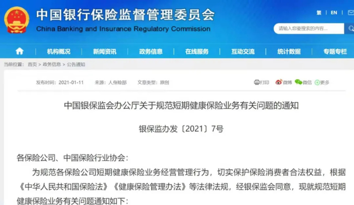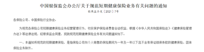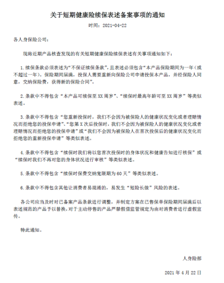 就在4月22日,银保监会人身险部下发《关于短期健康险续保表述备案事项的通知》,通知中明确要求,条款中不得包含“本产品可续保至××周岁”“续保时最高年龄可至××周岁”等类似表述;