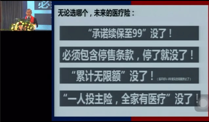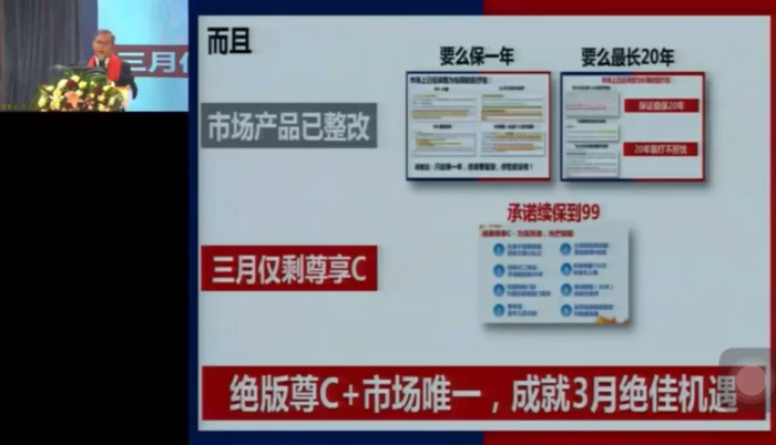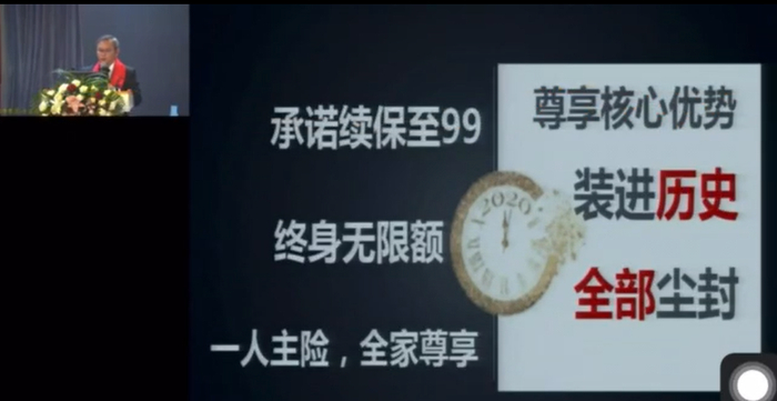 “(健康尊享)它的更换成本是非常的高,这种保证续保的健康险,客户一旦拥有,是非常非常难以更换的…对客户来讲,这是一次最后机遇,以后再也没有这种保证续保的,能够保终身的医疗险,市场上没有了,客户如果不抓住这次机会去购买,就没有这个机会了。“