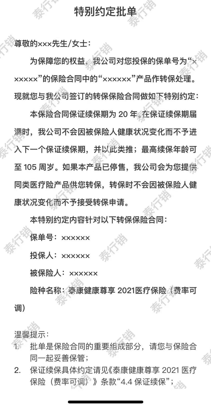 为了不那么难看,泰康给出了一个补救措施方案,在转保的同时出局一份特别约定批单。