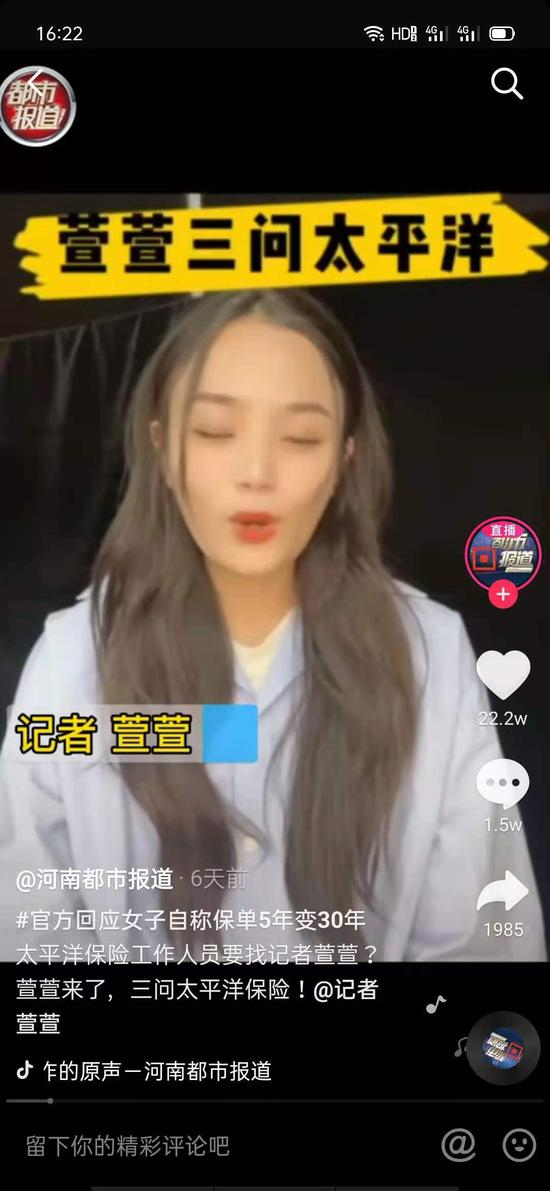 当然以上都是我个人的猜测,因为我觉得这个事件从媒体报道视频的内容上漏洞太多,而之后都市频道的记者——萱萱,也就是此次报道太平洋事件的记者,在抖音上发表了一个视频,说是太平洋公司的相关人员要找该记者“对峙”,该记者做出了回应。