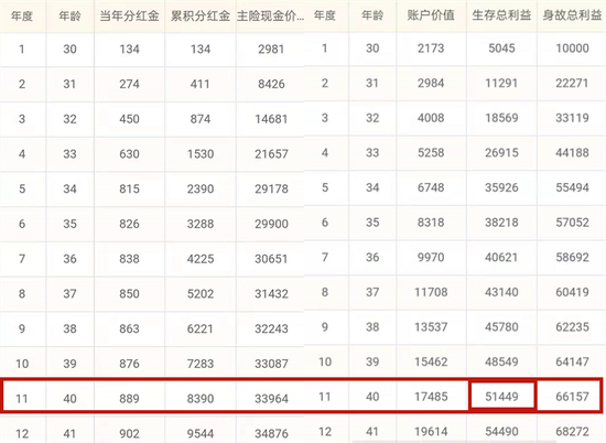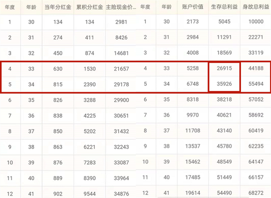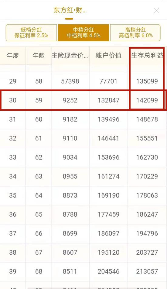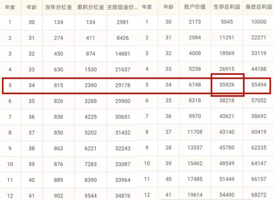 从这个表中看到,30年末生存总利益为14万2099元,5万本金分5年存入保险公司30年,获利9万2099元;相当于5万本金一次性存银行30年,平均年化收益率为6%的水平。