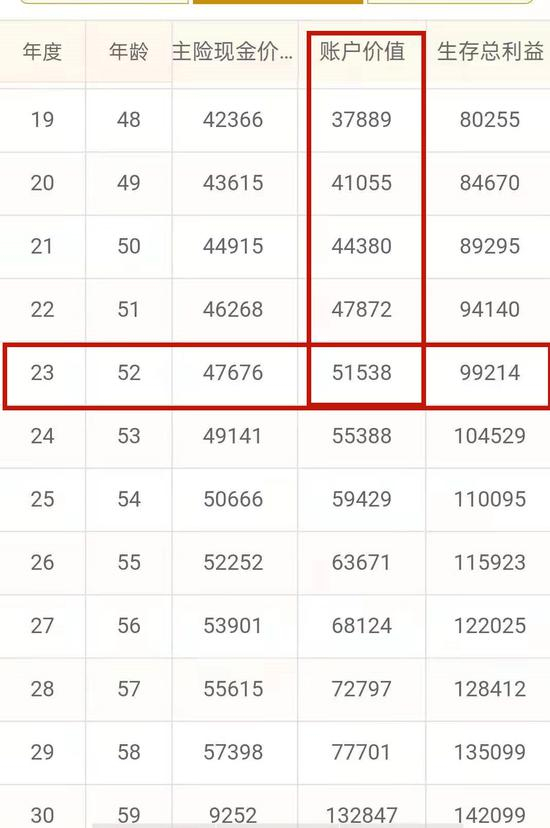 第二,我们什么时候能拿出这5万本金来用,那就要看万能账户什么时候能达到5万本金,经过推算是在保单第23年度末,万能账户金额为5万1538元,说明这时候取出相当于保险公司返还了你的本金,之后这款保险在重新凭借每年的固定返还进入万能账户重新计息,30年到期在额外给5万。
