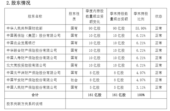 具体来看,财政部出资90亿元,占比55.90%;中国再保险(集团)股份有限公司出资10亿元,占比6.21%;中国农业发展银行出资10亿元,占比6.21%;中华联合财产保险股份有限公司出资10亿元,占比6.21%;中国人寿财产保险股份有限公司出资10亿元,占比6.21%;北大荒投资控股有限公司出资10亿元,占比6.21%;中国太平洋财产保险股份有限公司出资8亿元,占比4.97%;中国平安财产保险股份有限公司出资8亿元,占比4.97%;中国人民财产保险股份有限公司出资5亿元,占比3.11%。