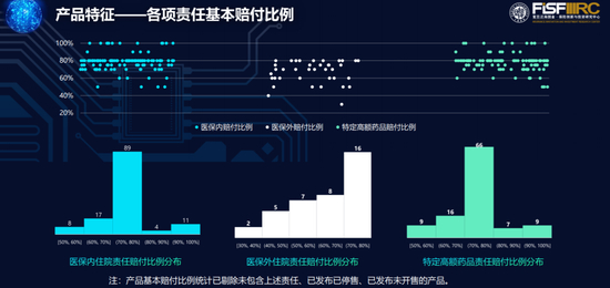 产品基本责任包括医保内住院责任、医保外住院责任、特定高额药品责任。多数产品责任覆盖医保内住院责任和特定高额药品责任,医保外住院责任存在不足。各责任赔付比例存在差异,医保内住院责任和特定高额药品责任赔付比例多数在70%-80%之间,部分产品赔付比例高达100%。医保外住院责任赔付比例明显偏低,个别产品医保外赔付比例仅为30%。是否患有既往症、是否异地就医、是否使用医保结算将对惠民保产品赔付比例产生较大影响。