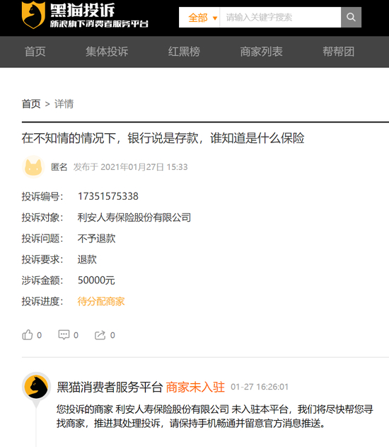 据天猫投诉APP,2021年1月27日,该平台某匿名消费者表示,其在不知情的情况下,办理的存款,说是存5年5万可以取6万,但是后来发现是保险,而且写的保险期限15年,目前已经是第三年,就此情况,利安保险尚未作出回复。