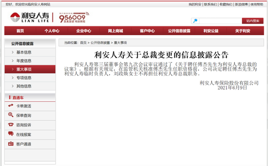 2021年6月20日,利安人寿发布公告称,利安人寿第三届董事会第九次会议审议通过了《关于聘任傅杰先生为利安人寿总裁的议案》。根据有关规定,在监管机关核准傅杰任职资格前,利安人寿决定聘任傅杰为利安人寿临时负责人,刘政焕不再担任利安人寿总裁职务。