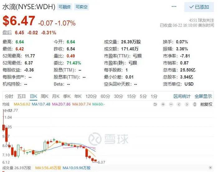 金融虎APP注意到,第一季度财报发布后,水滴公司股价连续多个交易日下跌。截至美股上周五收盘,水滴公司的股价报6.82美元,市值26.88亿美元。而IPO时为每股12美元。美东时间周一,水滴盘中创下了6.37美元的最低价,这也是其5月7日在纽约股市上市以来的最低水平。截至美股周二收盘,水滴股价为6.47美元,这较其IPO时12美元的发行价已跌去46%,市值也随之跌至25.5亿美元,较其IPO时47亿美元的估值已近“腰斩”。