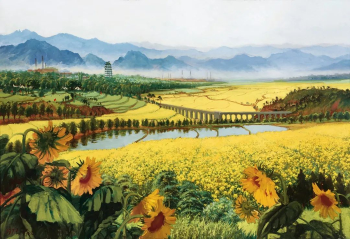 《战地黄花分外香》是吴作人创作于1977年的油画。时值毛泽东主席逝世一周年之际,吴作人为“寄无限缅怀”,取毛泽东《采桑子·重阳》词意,创作了此作。作品的取景视野宽广,构图横阔稳重,对画中各景物元素的取舍组合经营有度。在群山的环抱下,工厂和城镇隐约可见,宝塔与丛林、梯田相映成趣;再近一些的位置,由桥梁和水塘组成的一个倾斜的“T”字形把远景与近处金灿灿的油菜花田巧妙地链接起来。近景则是几株盛放中的向日葵特写。然而毛泽东词中所述之“黄花”在画中主要由油菜花和向日葵加以表现,但两者显然不是同季作物。艺术家以国画的选景立意方法对客观物象加以主观提炼编排,虚拟了一个超越自然时令的金色季节,不拘一格地将油画状物写生的真实与国画“搜尽奇峰打草稿”的写意完美交融,可视为吴作人油画民族化探索上风景题材的代表之作。