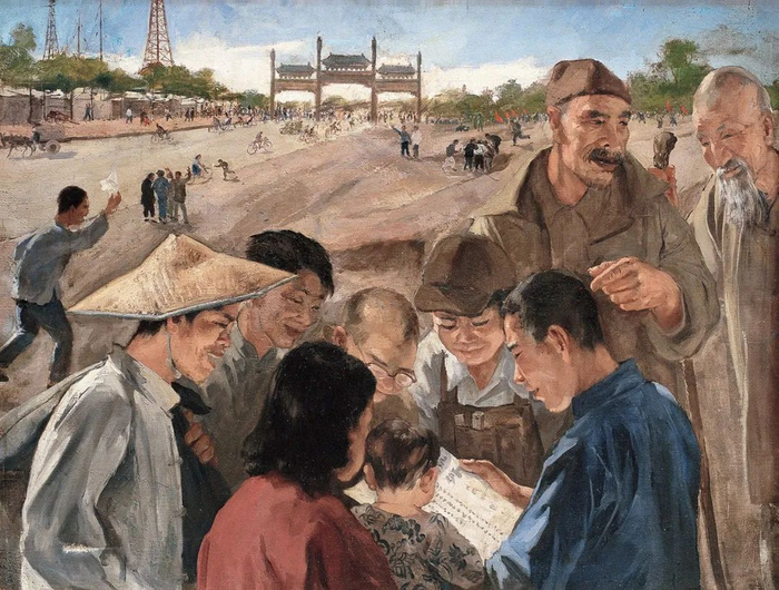 刘开渠为人民英雄纪念碑所创作的浮雕中,就有一组《胜利渡长江》表现这一历史性时刻。浮雕中的解放军战士目光如炬,神情坚定,英勇战斗的动态非常有感染力。在吴作人的《解放南京号外》一画中,则记录了南京解放的消息第二天传到北平,人们在街头争相抢购传阅报纸“号外”的情景。围观报纸“号外”的人群和远处三五成群欢呼雀跃的市民们,仿佛把我们带回到那一年的4月24日。