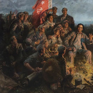 这幅画于1976年完成,画家沈尧伊创作此画时正值青壮年时期,可谓意气风发、豪情万丈。出于对于长征精神的无限向往和崇拜,1975年用三个月的时间重新走了一趟长征路。《革命理想高于天》用写实的手法和浪漫的光影对比,描绘了一个豪迈而真实的场面:在那么艰苦的环境下,年轻的红军战士在休息时,围坐在熊熊的篝火旁,聚精会神地听着毛主席进行热情洋溢的演讲,眼睛里满是对未来无限的憧憬与希望。