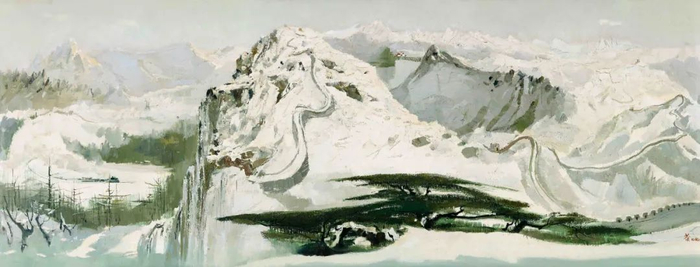 吴冠中的这幅《北国风光》,是为完成机场壁画工程任务所创作的画稿,画家根据毛泽东《沁园春·雪》中“山舞银蛇,原驰蜡象”两句的意象绘制了这件作品。整个画面的布局围绕前景主峰展开,四周的配景与主峰产生环绕形的呼应关系,而配景彼此之间也通过林海、火车、水坝等保持着虚虚实实的内在联系。可以说,无论是那简单数笔画就的长城,还是环抱主峰的远山,都体现出画家在经营构图时的良苦用心。所以连吴冠中自己也会说这画稿“是尽了全力的,所以其实不再是稿”,已体现了巨幅作品的最终效果。
