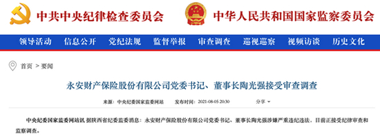 8月5日,中共中央纪律检查委员会官网发布了一则“永安财产保险股份有限公司党委书记、董事长陶光强接受审查调查”的消息引爆了朋友圈,震惊了保险行业。