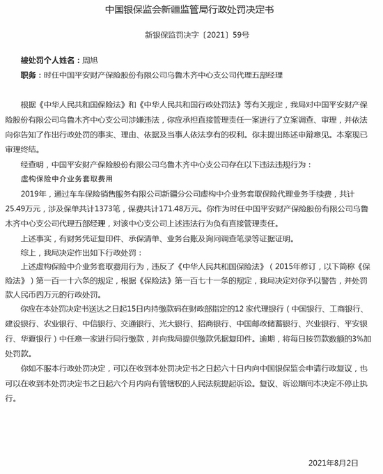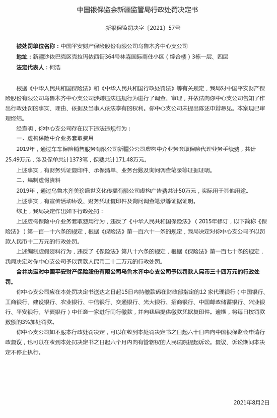 平安财险乌鲁木齐中支被罚34万:虚构保险中介业务套取费用