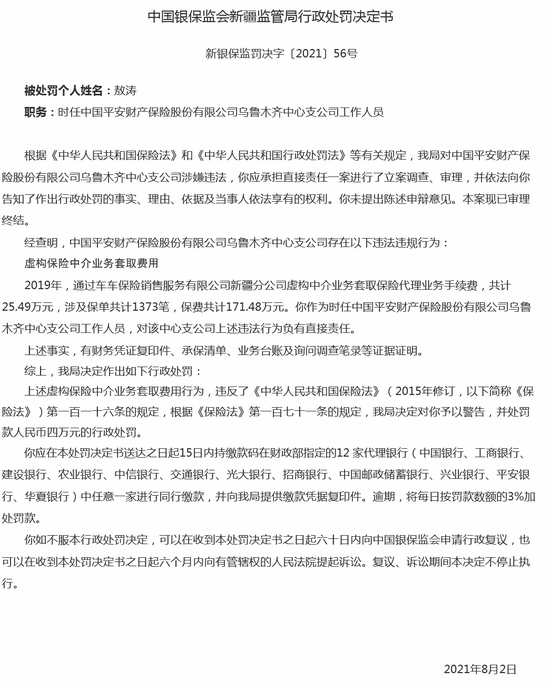 8月11日消息,中国银保监会新疆监管局行政处罚决定书显示,中国平安财产保险股份有限公司乌鲁木齐中心支公司因存两项违规行为,被罚34万元。