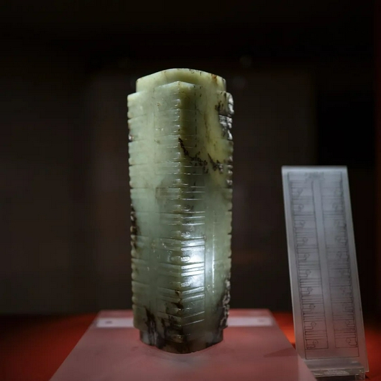 大厦保留了玉琮内圆外方的筒状几何形状,立面以微小角度向外倾斜,实现上大下小的形态;立面被中央的竖槽一分为二,显露出内部圆柱体的元素,并在塔楼顶部得到完整的体现;楼层之间的不锈钢凹槽通过内凹深度有节奏的变化,以模仿玉琮表面精美的浮雕线条。