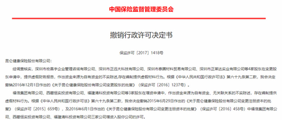 2017年12月,原保监会在官网发布《撤销行政许可决定书》,称昆仑健康保险曾经和现有的累计7名股东均存在资金来源陈述方面有不实的问题。因此原保监会决定撤销当初监管允许其变更股东或增资入股的有关批复。同时要求自决定下发之日起3个月内引入合规股东,在引资完成前不得向违规股东退还入股资金。