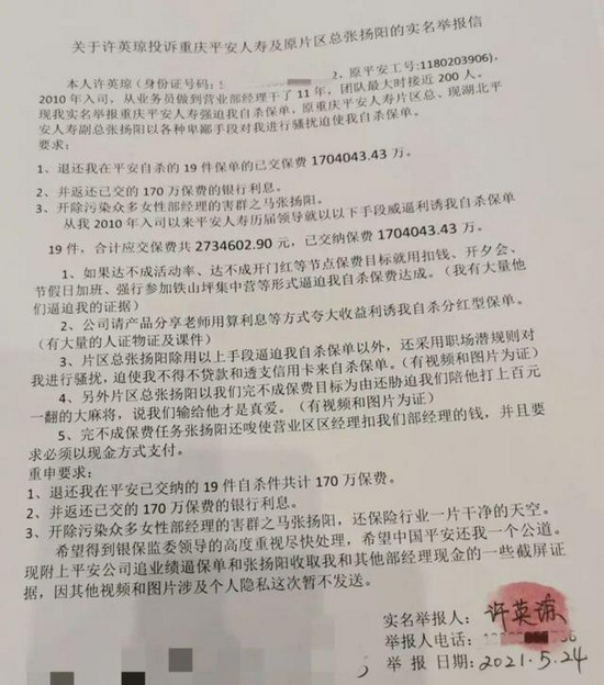 近日,平安人寿重庆分公司11年老员工许英琼实名举报公司以各种手段诱导、逼迫代理人给自己和家人投保19份保单,保费共计273万元的视频火了。