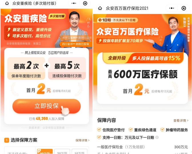 *众安在线微信公众平台及APP上“首月2元”保险产品