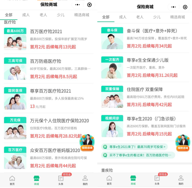 在最近推出的“8·18大促”活动中,“尊享e生综合意外2021”“百万医疗险2021”“众安重疾险”等3款产品同样是以“首月2元”为噱头进行推广。而在“众安保险”APP商城中发布的所有25款保险产品中,其中11款产品是以“首月2元”或“首月3元”作为宣传方式进行推广,涉及医疗险、重疾险、意外险等多个险种。
