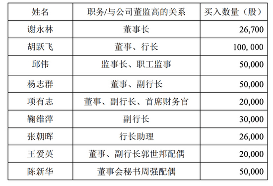 其中,谢永林买入2.67万股,平安银行行长胡跃飞买入10万股;平安银行监事长职工监事邱伟,平安银行副行长杨志群、项有志、鞠维萍,平安银行行长助理张朝晖,平安银行董事、副行长郭世邦配偶王爱英,平安银行董事会秘书周强配偶陈新华也纷纷增持。