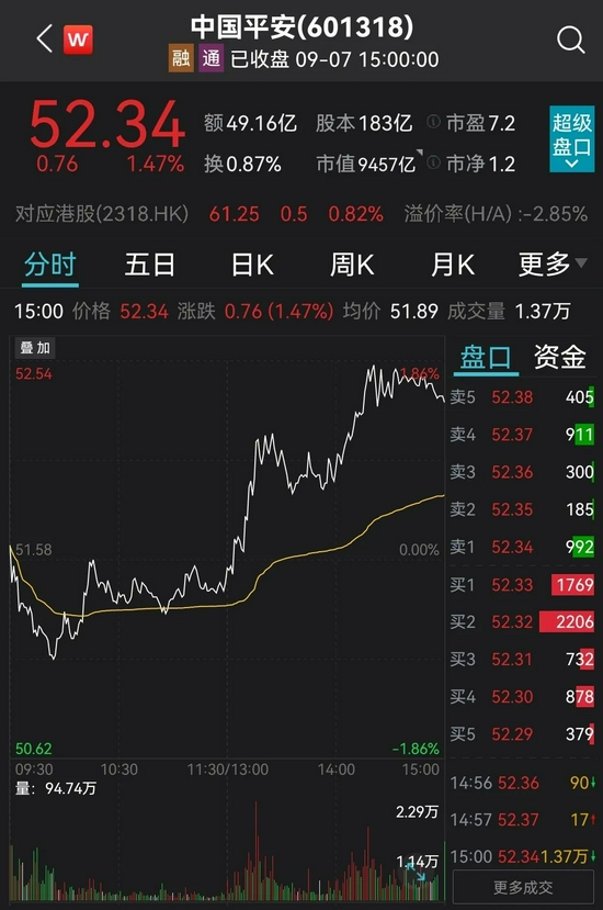 截至9月7日收盘,中国平安A股股价收于52.34元,相较于前一交易日收盘价51.58元,上涨1.47%。