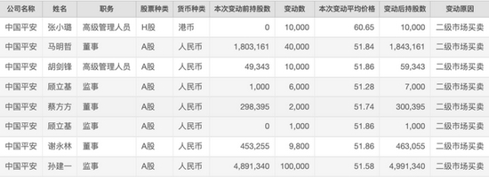 根据上交所披露的数据显示,8月27日,中国平安总经理兼联席CEO、平安银行董事长谢永林和中国平安监事会主席孙建一分别买入9800股和10万股,共耗资约51万元和516万元。到9月3日,更多董事、监事、高级管理人员加入增持行列,包括中国平安联席首席执行官陈心颖,中国平安副总经理、首席人力资源执行官蔡方方,中国平安合规负责人、首席运营官张小璐,中国平安稽核监察部总经理胡剑锋等人。