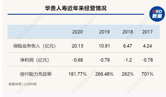 财务数据显示,2017年-2020年,华贵人寿保险业务收入从开业首年的4.24亿元,增加至2020年的20.13亿元。从盈利数据看,公司成立后前四个年度分别亏损0.78亿元、1.2亿元、0.79亿元、0.68亿元,累计亏损3.45亿元。