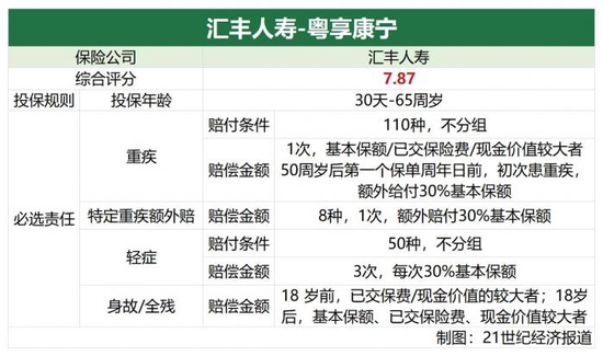 汇丰人寿粤享康宁重疾险综合评分7.87分,排名第五位。保障得分24.15,排名第七位。