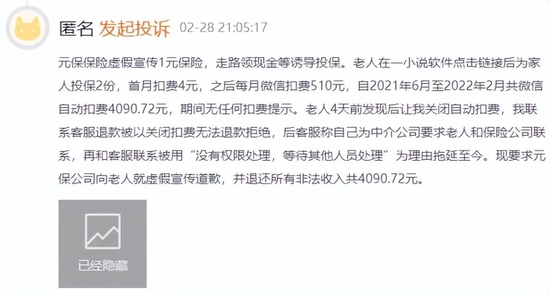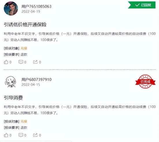 2月28日、4月15日、4月19日也另有相关投诉。2月28日的投诉显示,“元保保险虚假宣传1元保险,走路领现金等诱导投保。老人在一小说软件点击链接后为家人投保2份,首月扣费4元,之后每月微信扣费510元,自2021年6月至2022年2月共微信自动扣费4090.72元,期间无任何扣费提示。老人4天前发现后让我关闭自动扣费,我联系客服退款被以关闭扣费无法退款拒绝,后客服称自己为中介公司要求老人和保险公司联系,再和客服联系被用‘没有权限处理,等待其他人员处理’为理由拖延至今。现要求元保公司向老人就虚假宣传道歉,并退还所有非法收入共4090.72元。”此外,还有两名用户分别在4月15日、4月19日投诉称,(元保)利用中老年不识文字,引导其低价格(一元)开通保险,后续又开通较高价格的自动续费(100元)。